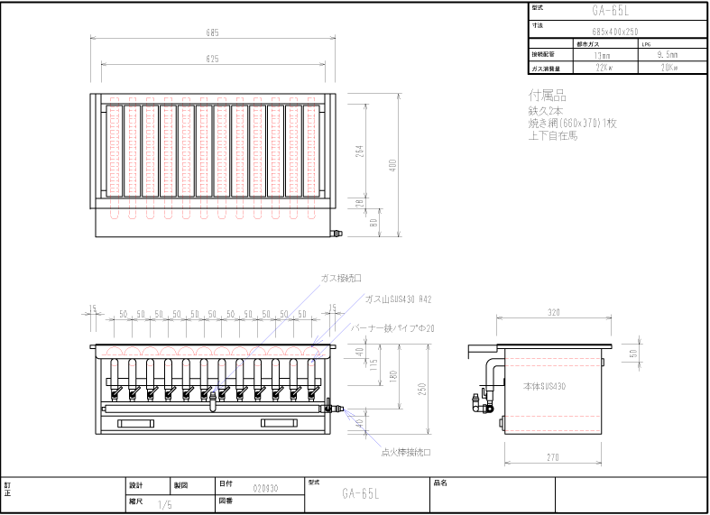 ガス焼き台網の高さを上下自在に調節出来る馬付きです。とうもろこしや、だんご焼き器として最適です。鉄久2本と焼き網1枚が付属します。 写真上がAK65L、下がAK85Lです。 外寸 AK50L 幅500×奥行400×高250 有効焼き面積AK50L 幅440×奥行265 |