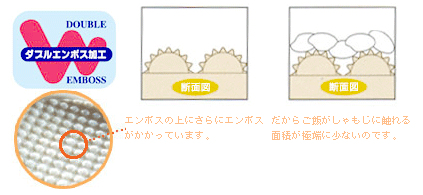 プラスチック表面のデコボコに、更に微細なデコボコ(シボ)を設けた二重のデコボコ形状をダブルエンボスと呼んでいます。 ※取扱い上の注意点 ダブルエンボスの表面はキズを一番嫌います。表面がキズに被われると、ご飯が付き易くなります。洗浄の際はスポンジをご利用ください。 使用後そのまま放置しておくと、ご飯のノリが残り、つき易くなる原因になります。 長時間の使用により付き易くなりましたら、軽く水をつけてご使用ください。炊飯ジャー等高温の中に放置しておくと、付き易くなります。